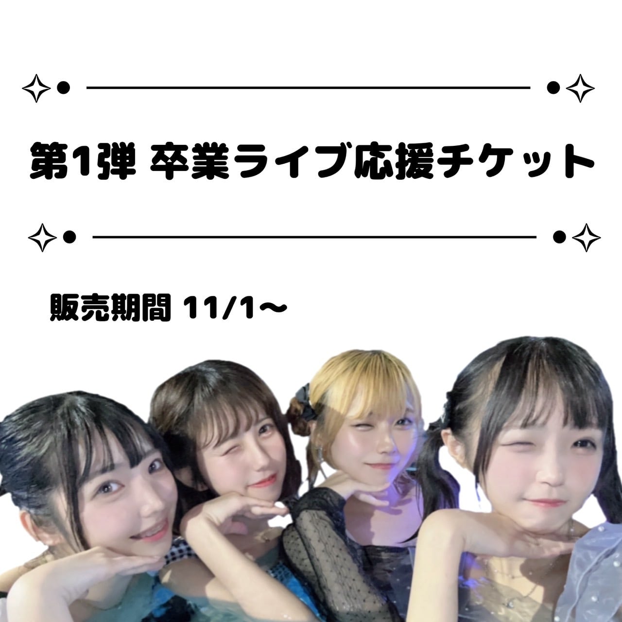 ブロマイドセット+ステージ動画(店撮影)+チケ代4,000円割引券+撮影券(自由)+公開練習見学+推しメンのミニメセカ+卒業ライブ記念Tシャツ(サイン入り)+全員集合チェキ(当日)